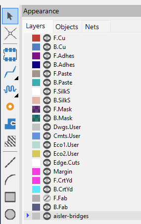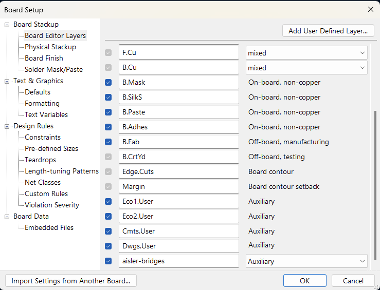 - Create a user layer (File → Board Setup… → Board Editor Layers → Add User Defined Layer) and rename it to “aisler-bridges”