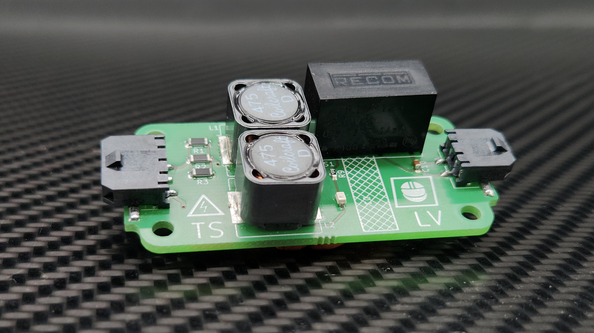 Technically, it converts our accumulator voltage (up to 600V) down to 12V using a VIPER06 high-voltage converter. From there, it utilizes an R12P12S isolated DC/DC converter to provide a safe, galvanically isolated 12V output for the indicator LED.