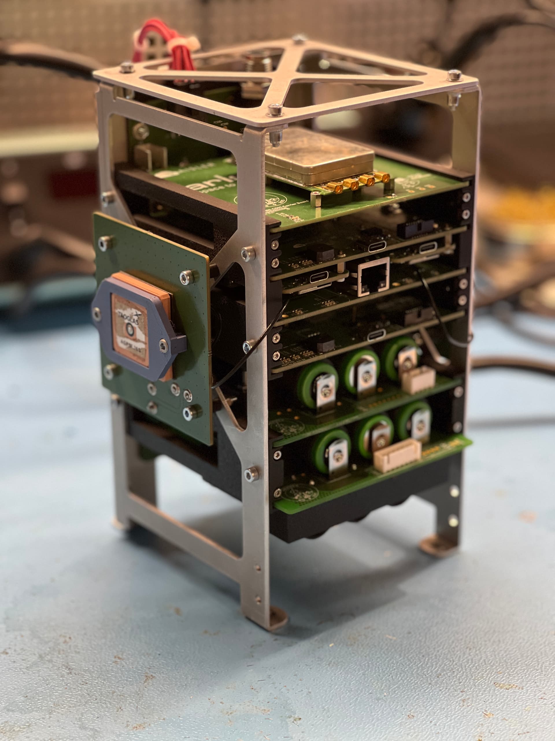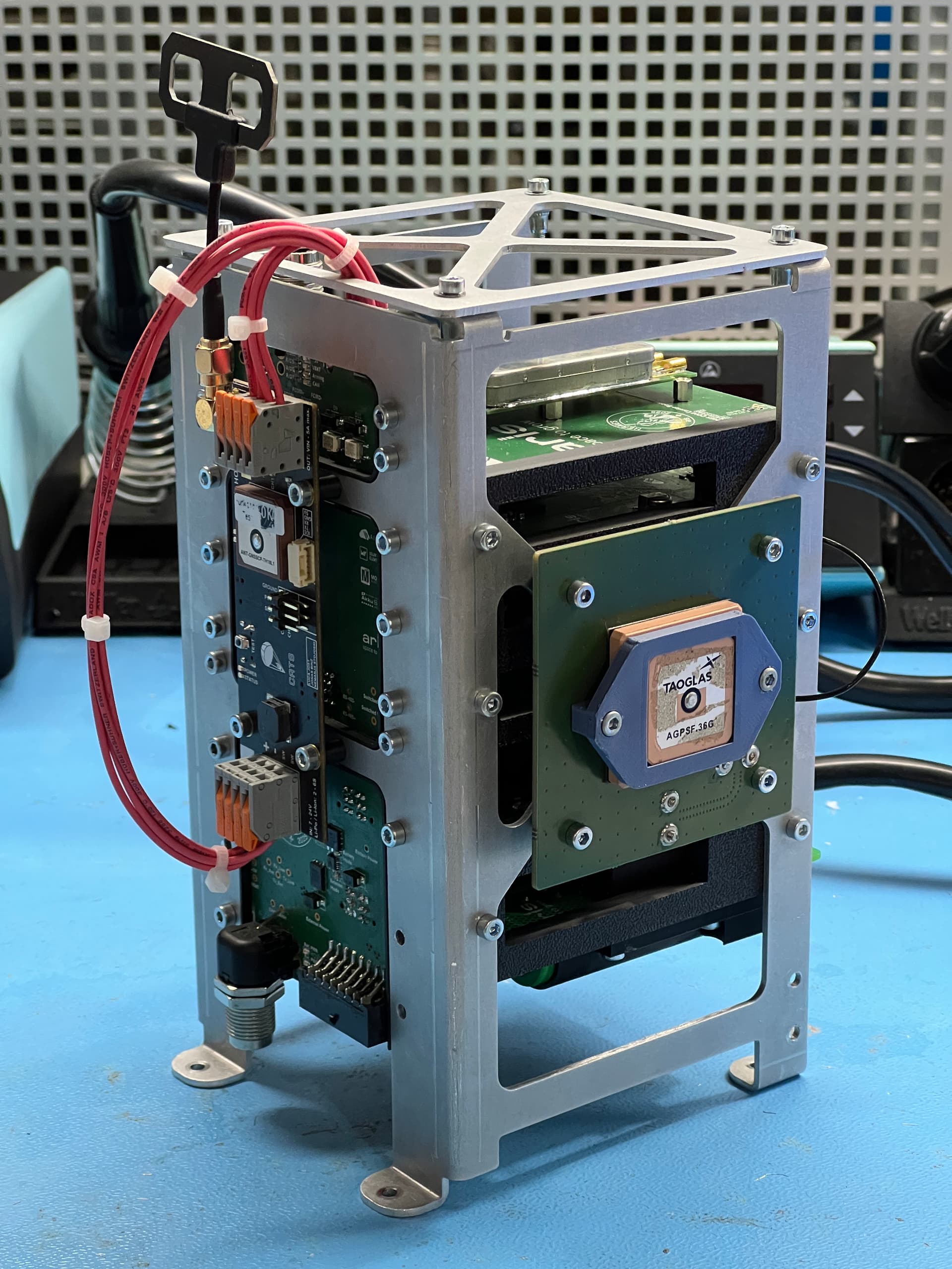 The main avionics stack is composed of seven PCBs all mounted in an aluminum frame. These are the backplane, which connects all the PCBs in the stack and then from top to bottom, the communication PCB, the sensor PCB, the flight computer PCB, the power PCB, and two battery PCBs.