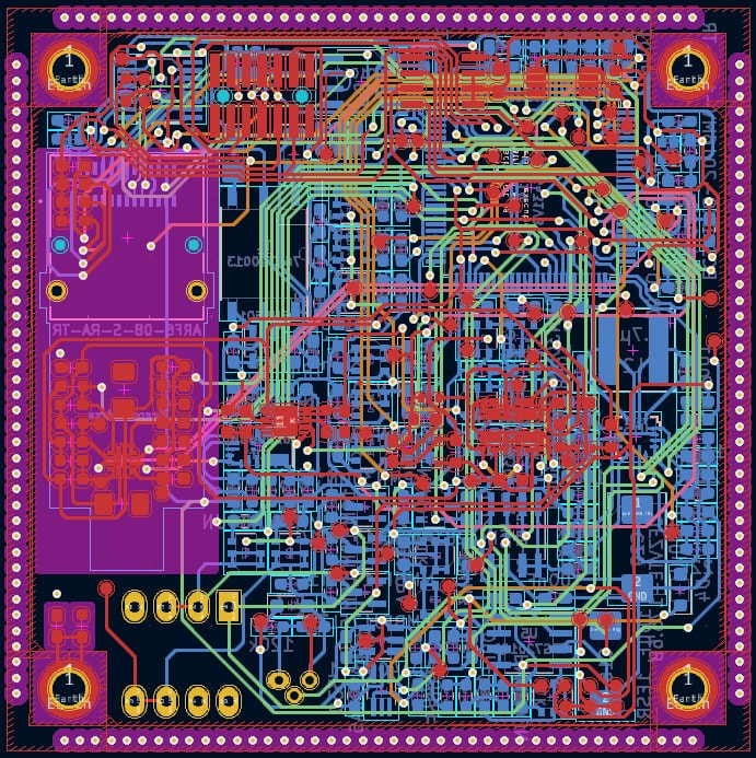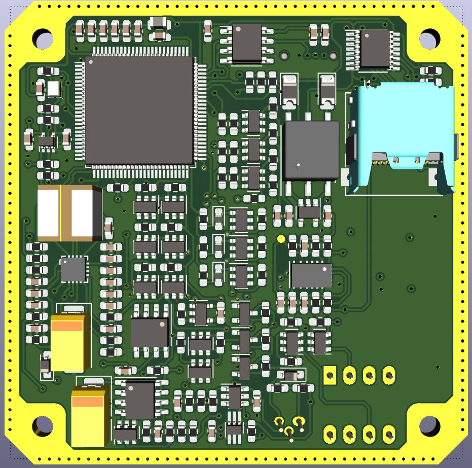 The MOBeFuse payload uses a compact 60 × 60 mm six-layer PCB integrating all power, sensing, and control functions. Around 250 components are mounted on the board, including eFuse ICs, sensors, amplifiers, and the STM32G431 microcontroller.