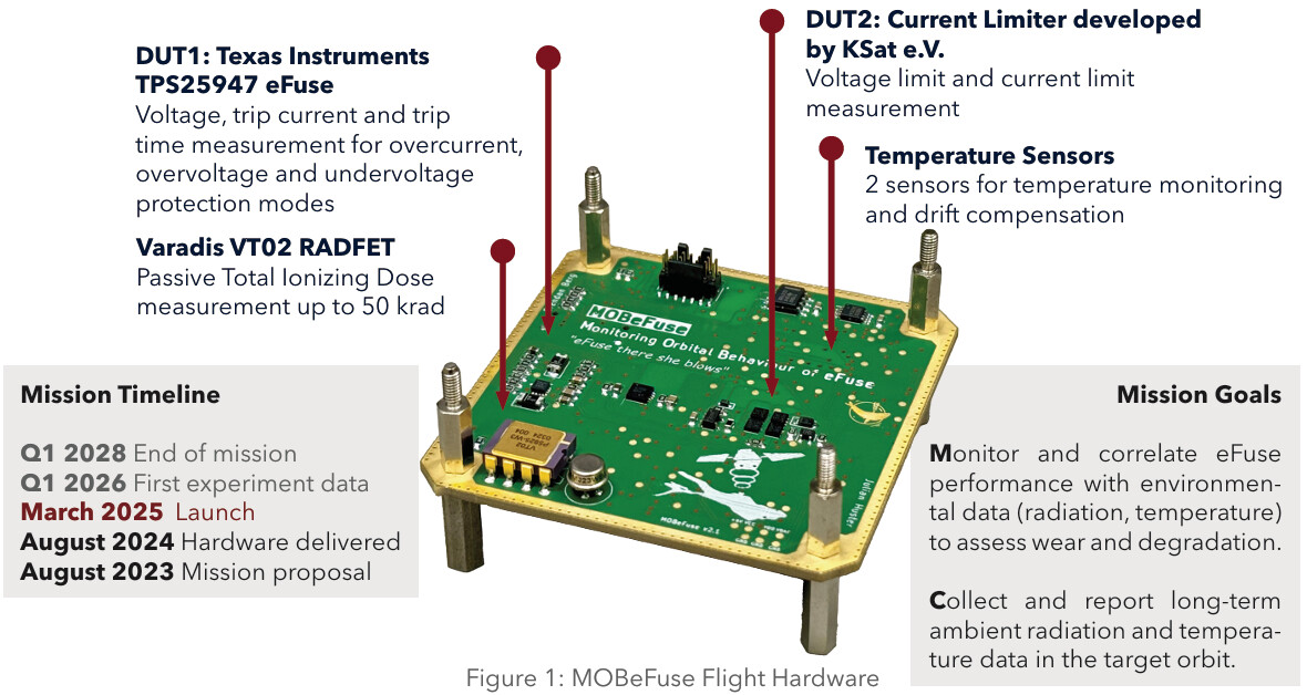 MOBeFuse is SeeSat e.V.’s in-orbit experiment to evaluate compact commercial electronic fuses (eFuses) for CubeSat power distribution , a smart, space-saving alternative to traditional Latching Current Limiters (LCLs). The project validates their protection functions and reliability under real Low Earth Orbit (LEO) conditions.