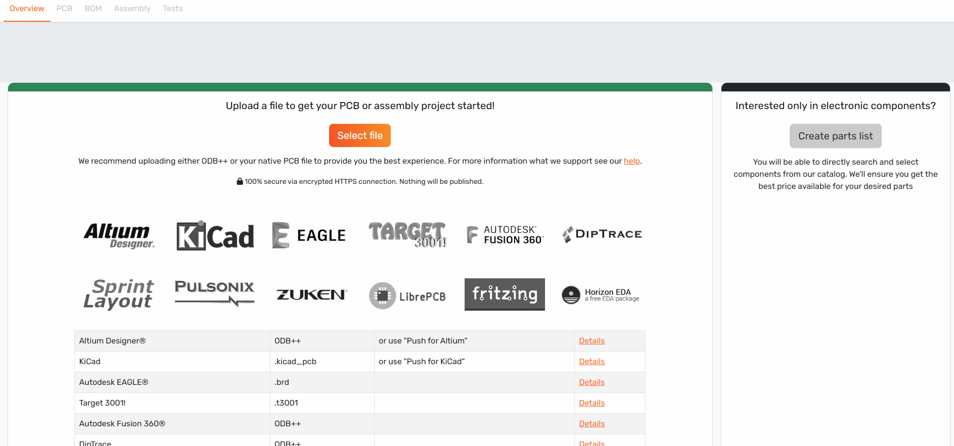 - Go to your project and either upload a PCB file or start directly with âCreate parts listâ on the right.