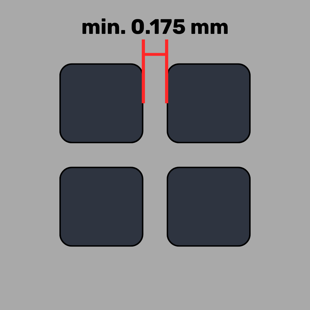However, the 100 µm thick stencil offered by us supports even challenging apertures like this 0.2x0.8 mm pad of a QFN with a pitch of just 0.35 mm. Thus, adjustments won’t be necessary in most cases. The example calculation below indicates that there is a robust margin to the minimum recommended values.